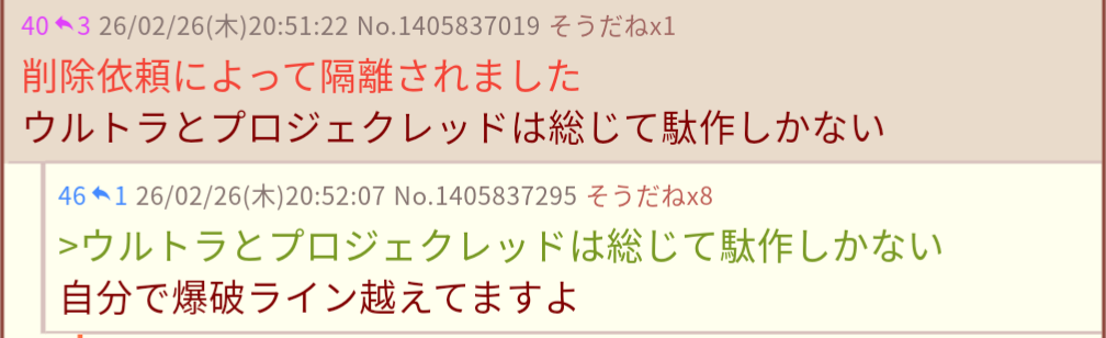 | … | 35無念Nameとしあき26/02/26(木)21:00:38No.1390219622+書き込みをした人によって削除されました |