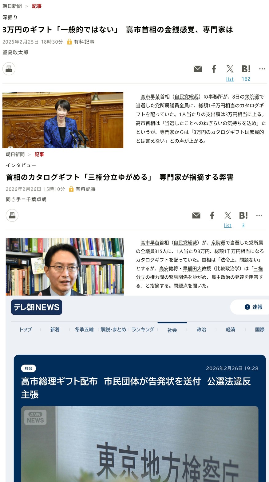 | … | 752無念Nameとしあき26/02/27(金)11:39:16No.1390319788そうだねx2 1772159956419.jpg-(1873440 B) >カタログギフトは公選法違反との理由で「検察庁法改正に反対する会」が東京地検に告発状送付だってよ(笑) |