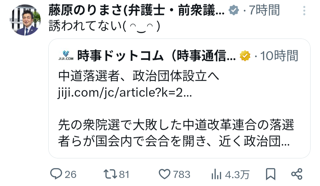 | … | 18無念Nameとしあき26/02/26(木)23:19:32No.1390254630そうだねx2>立民と公明が合併したわけじゃなくてそれぞれの党から離党した人たちが集まっただけだからセーフ |