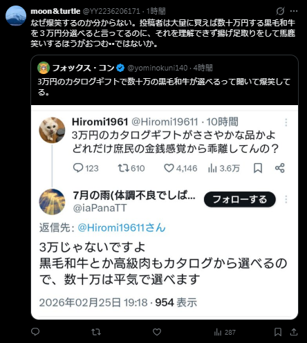 | … | 749無念Nameとしあき26/02/27(金)11:37:53No.1390319631+あーこれはカタログギフト禁止法案が国会に提出されるな |
