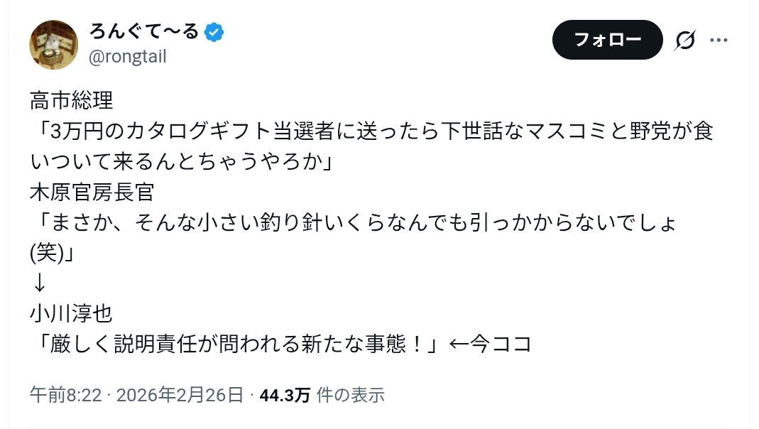 | … | 45無念Nameとしあき26/02/26(木)23:32:17No.1390257419そうだねx20>>カタログギフト追求は自爆しそうだから急にトーンダウンしたのマジ笑えるわ小川 |