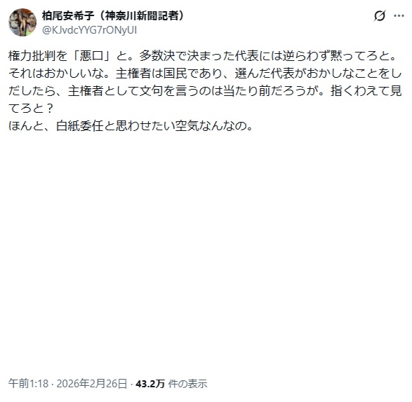 | … | 90無念Nameとしあき26/02/27(金)06:19:53No.1390289035+>「為政者への批判は絶えざるべき」というお題目自体には首肯できるんだけど |
