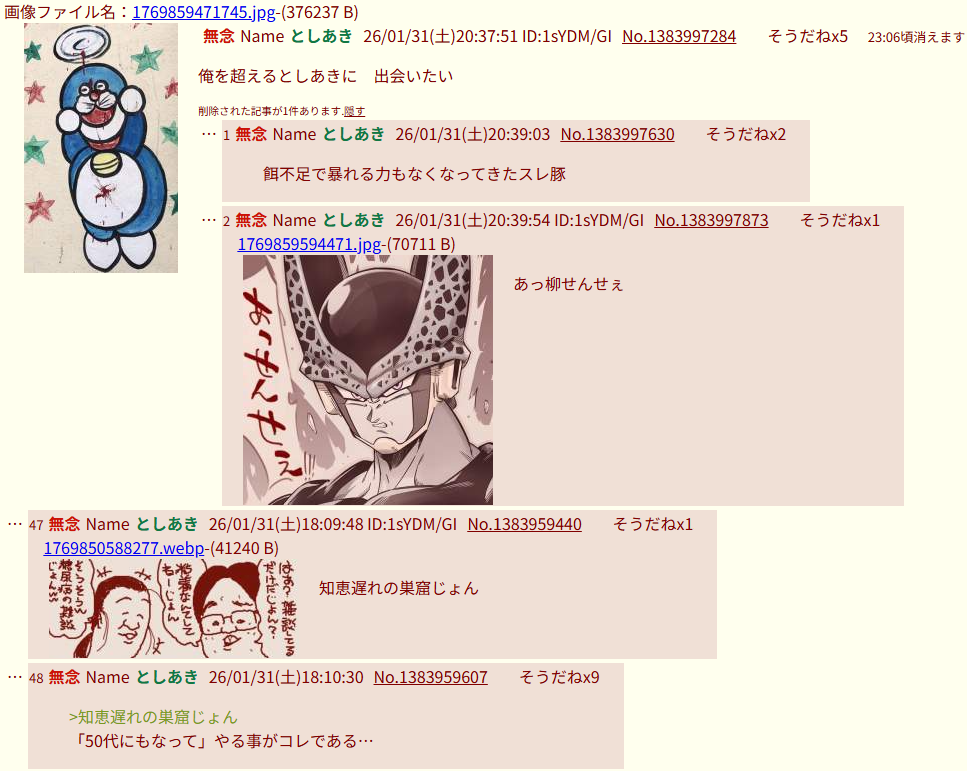 | … | 14無念Nameとしあき26/02/27(金)13:32:24No.1390338741そうだねx2>>>開示請求殺害予告性犯罪者河村ヤッチャイスレ |