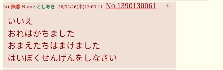 | … | 154無念Nameとしあき26/02/27(金)16:06:55No.1390360749そうだねx1>糖質ども悔しいねw悔しいねw |