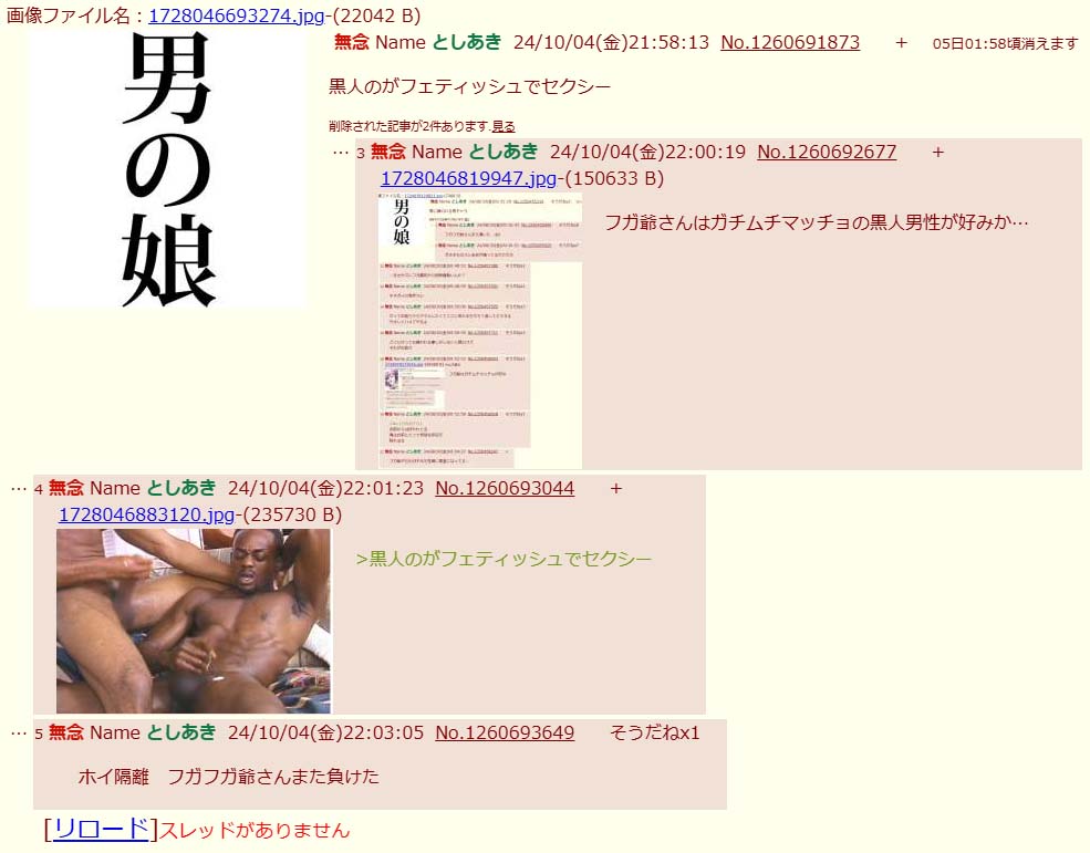 | … | 73無念Nameとしあき26/02/27(金)23:03:13No.1390462166+>ゲイで黒人男性が好きな変態爺だぞ |