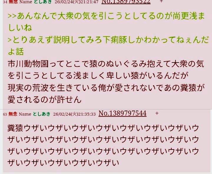 | … | 9無念Nameとしあき26/02/28(土)00:09:34No.1390479050そうだねx3猿に嫉妬してる奴がいたのは事実だからな |