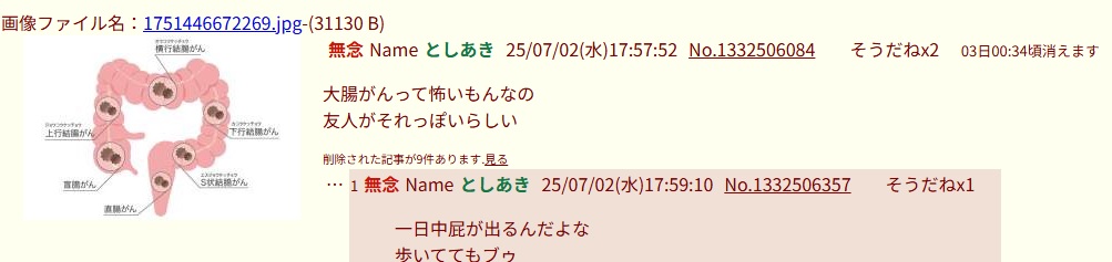 | … | 357無念Nameとしあき26/02/28(土)10:59:02No.1390542019そうだねx3>大腸がんという証拠を出せ |