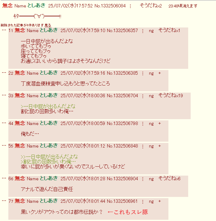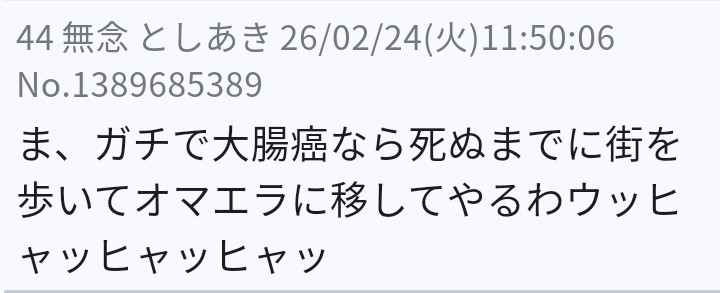| … | 347無念Nameとしあき26/02/28(土)10:56:31No.1390541569+本当に大腸がんなら掲示板荒らしなんかやってる暇無いと思うけど… |