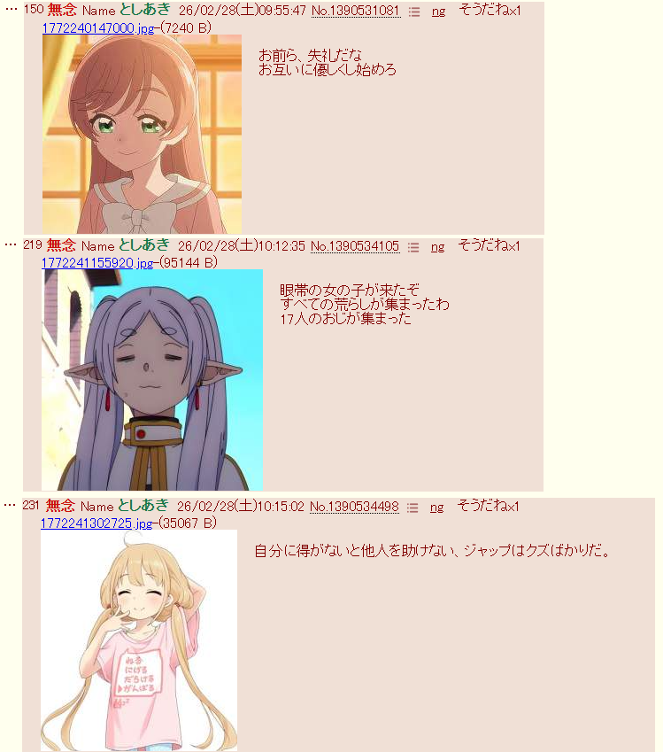 | … | 427無念Nameとしあき26/02/28(土)13:11:14No.1390567291+悔しかったらこのスレのログをナザレンコさんに送ってもいいんだよw |