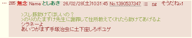| … | 339無念Nameとしあき26/02/28(土)10:53:45No.1390541075そうだねx5>>>こいつに構うやつもdel押さずに煽って日々の溜飲垂れてる奴も死なないかな |