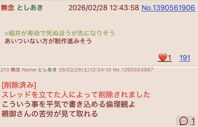 | … | 213無念Nameとしあき26/02/28(土)12:54:10No.1390563987+スレッドを立てた人によって削除されました |