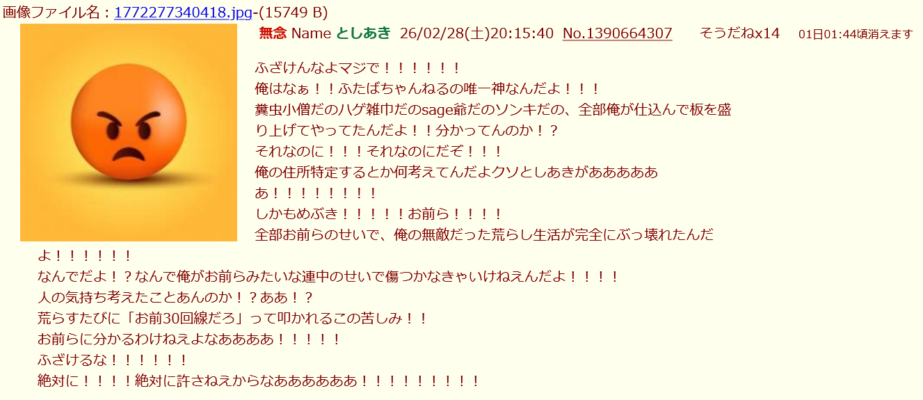 | … | 38無念Nameとしあき26/02/28(土)20:25:15No.1390667336+>全部お前らのせいで、俺の無敵だった荒らし生活が完全にぶっ壊れたんだよ!!!!!! |