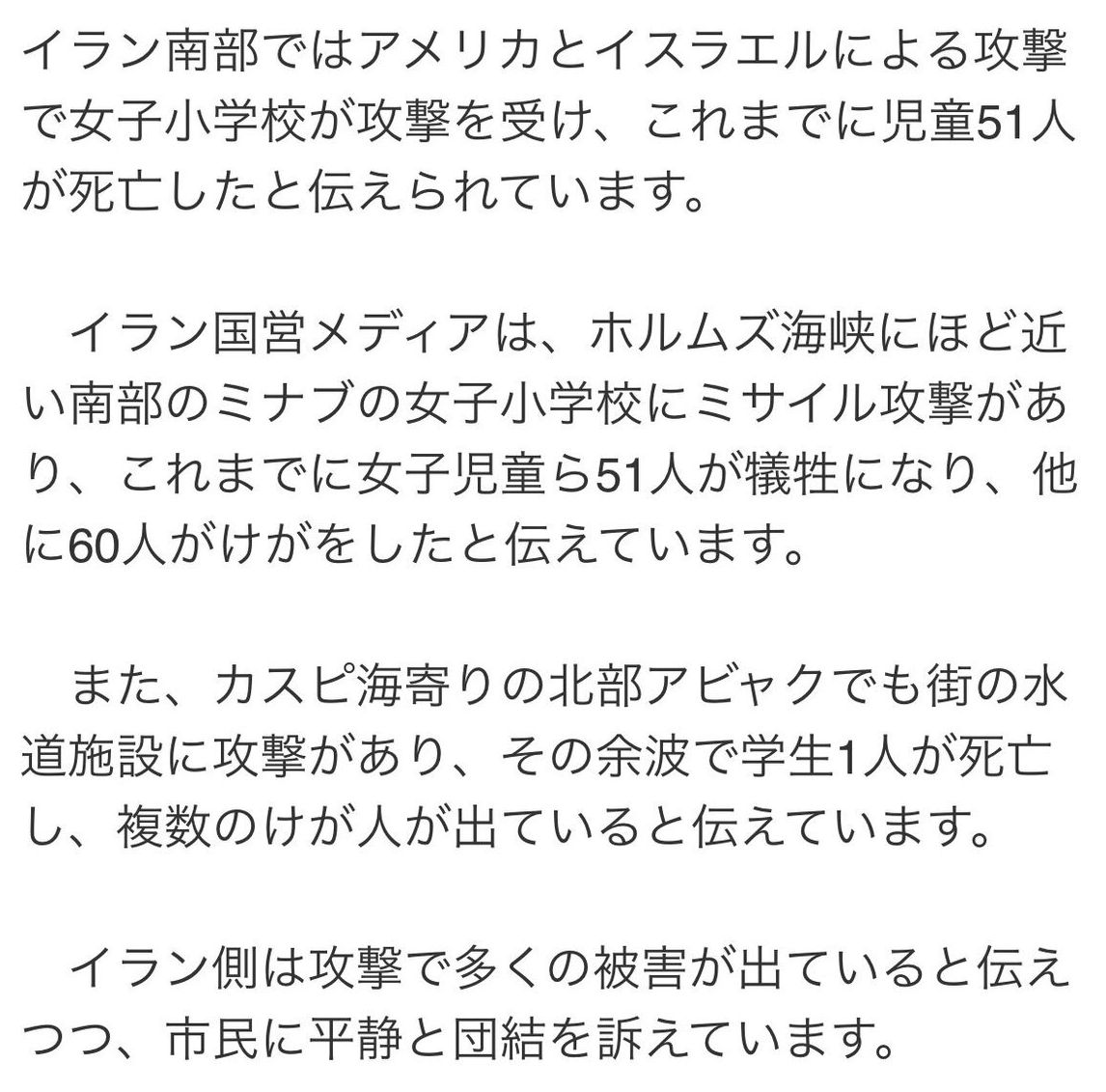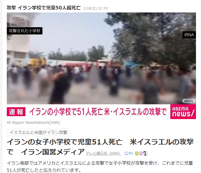 | … | 104無念Nameとしあき26/03/01(日)00:36:47No.1390734690+>イランの女子小学校で児童51人死亡 |