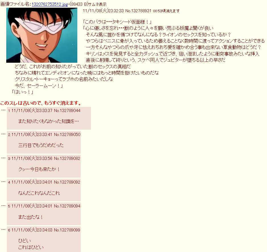 | … | 152無念Nameとしあき26/03/01(日)02:20:43No.1390750443+ 1772299243935.webm-(917530 B) >タキシード仮面の怪文書 |