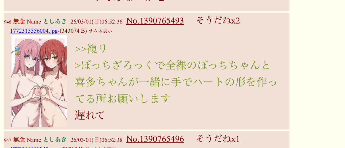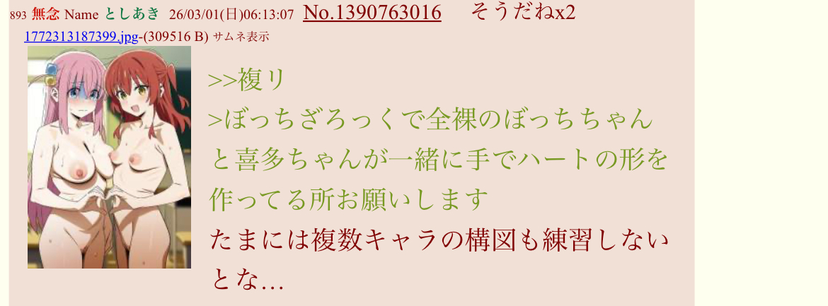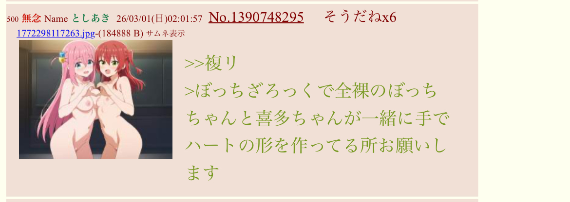 | … | 505無念Nameとしあき26/03/01(日)09:24:08No.1390785896そうだねx1>>ぼっちざろっくで全裸のぼっちちゃんと喜多ちゃんが一緒に手でハートの形を作ってる所お願いします |