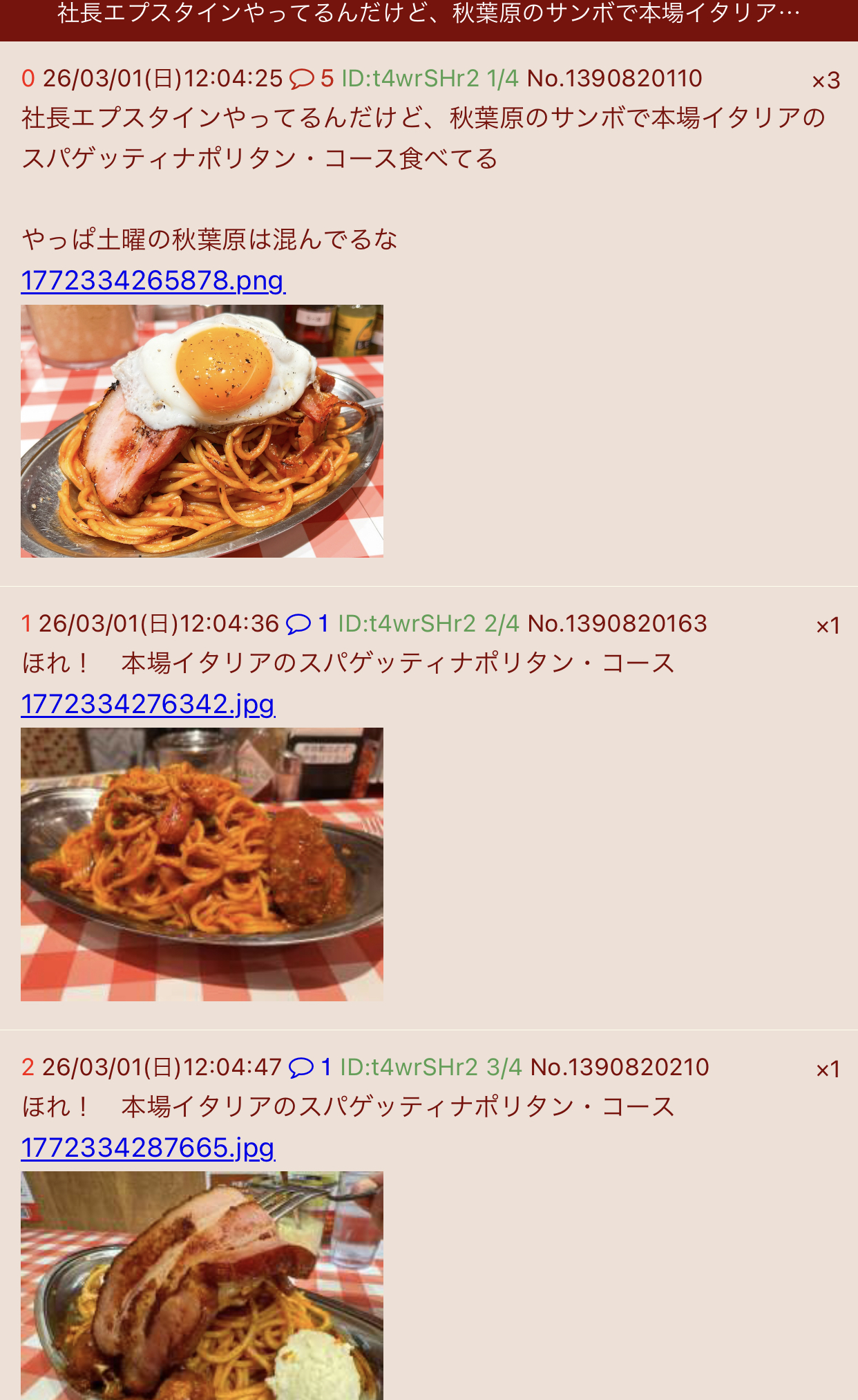 | … | 19無念Nameとしあき26/03/01(日)12:07:53No.1390820905そうだねx3>社長エプスタインやってるんだけど、秋葉原のサンボで本場イタリアのスパゲッティナポリタン・コース食べてる |