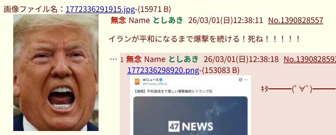 | … | 1なーNameなー26/03/01(日)12:04:36 ID:t4wrSHr2No.1390820163そうだねx1なー |