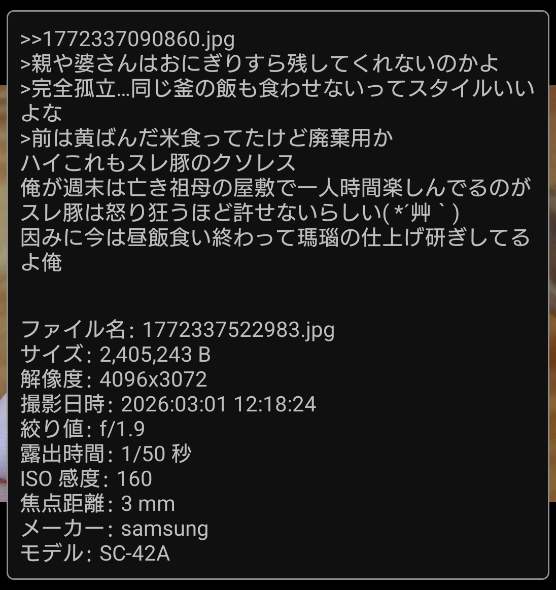 | … | 237無念Nameとしあき26/03/01(日)13:11:20No.1390837334そうだねx3>確かに晒すほうがアホって言いながら今撮った写真のExif消さないなんてことはあり得ないからな |