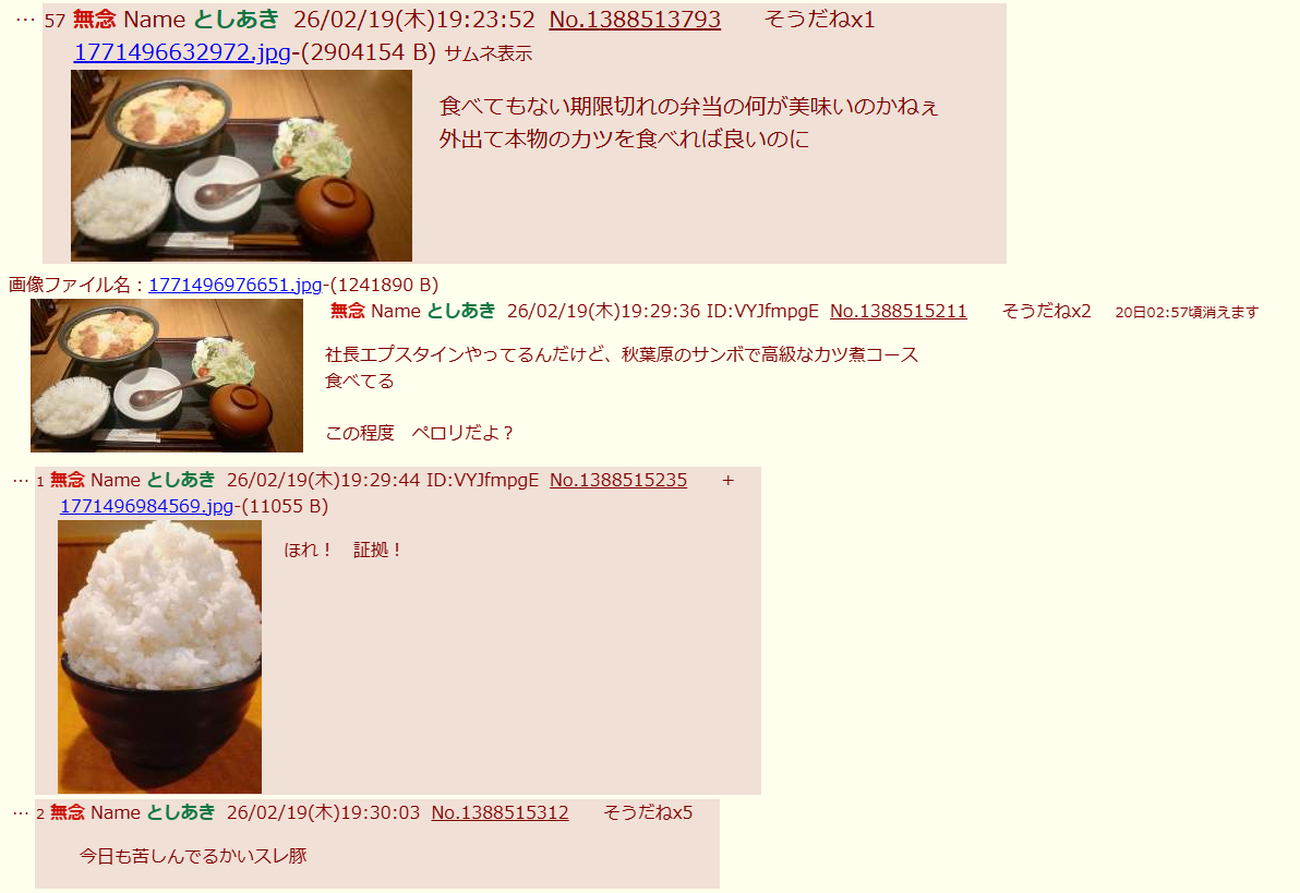 | … | 258無念Nameとしあき26/03/01(日)13:18:09No.1390838993そうだねx2>オッサンはなぁ…もう食べる事しか楽しみが無いんだ… |
