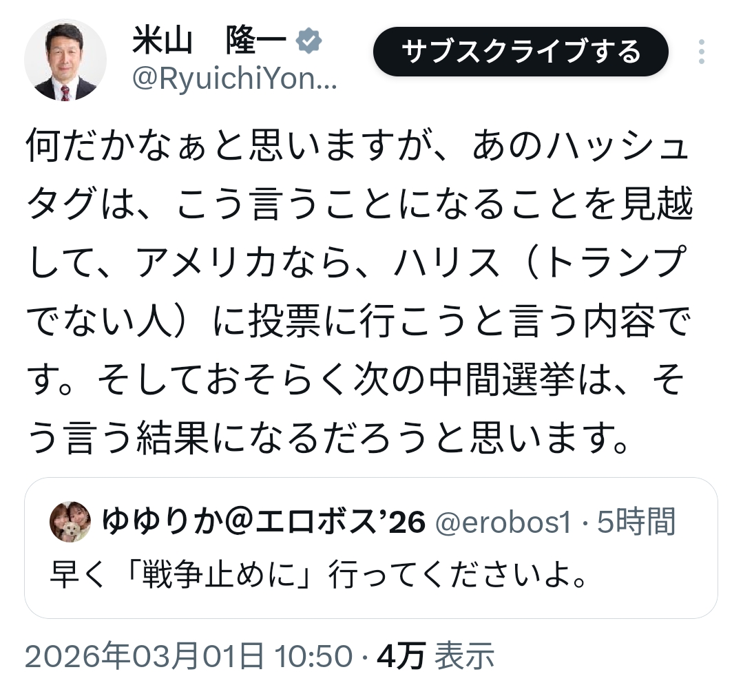 | … | 464無念Nameとしあき26/03/01(日)16:12:07No.1390877338そうだねx1>日本はアメリカについていく以外選択肢はないだろ進次郎が正しい |