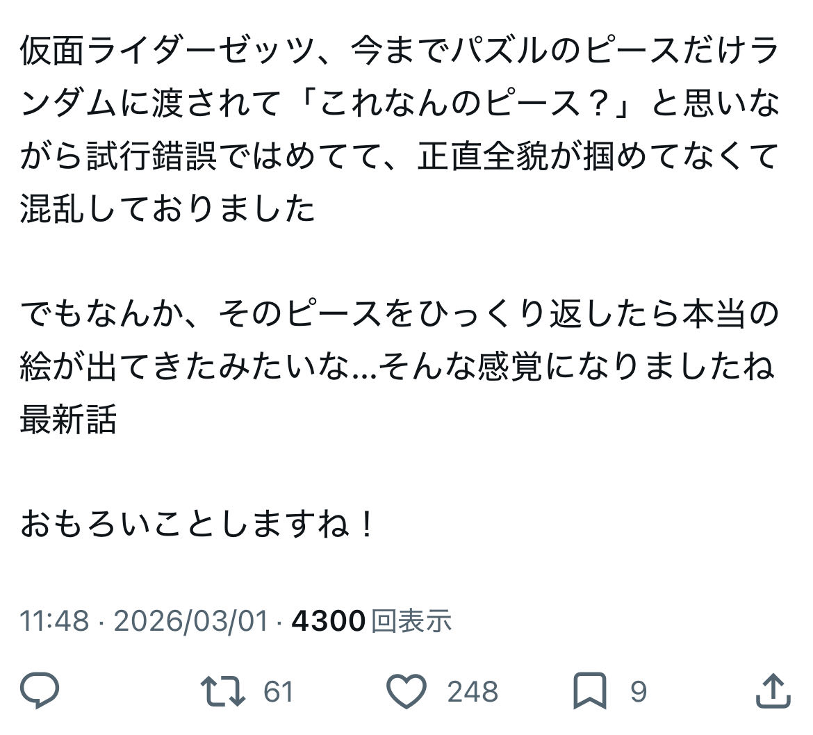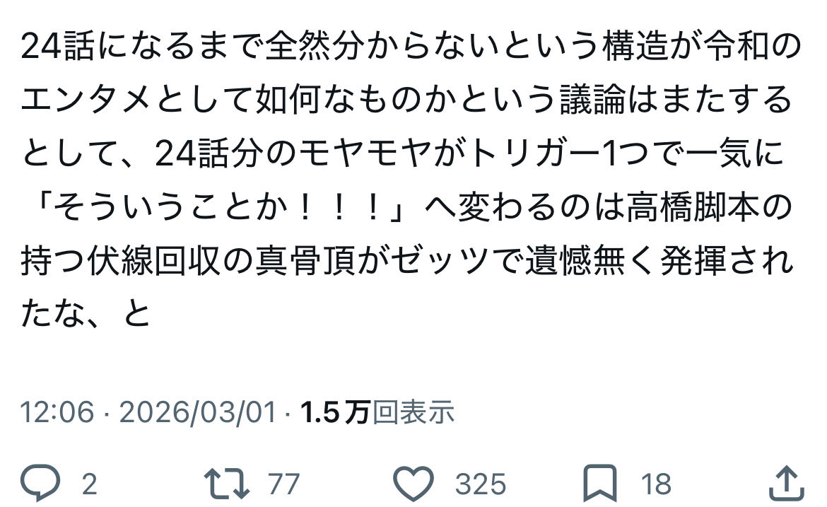 | … | 906無念Nameとしあき26/03/01(日)16:23:31No.1390879653そうだねx3>>ウルトラマンなら全話分の話数を丸々フリに使ったってことだからなあゼッツ |