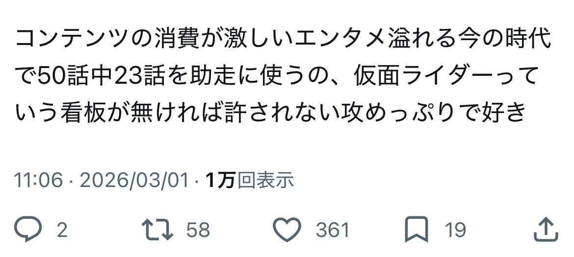 | … | 95無念Nameとしあき26/03/01(日)14:58:30No.1390861141そうだねx6仮面ライダーごと嫌いになりそうだからマジで頼むよ |