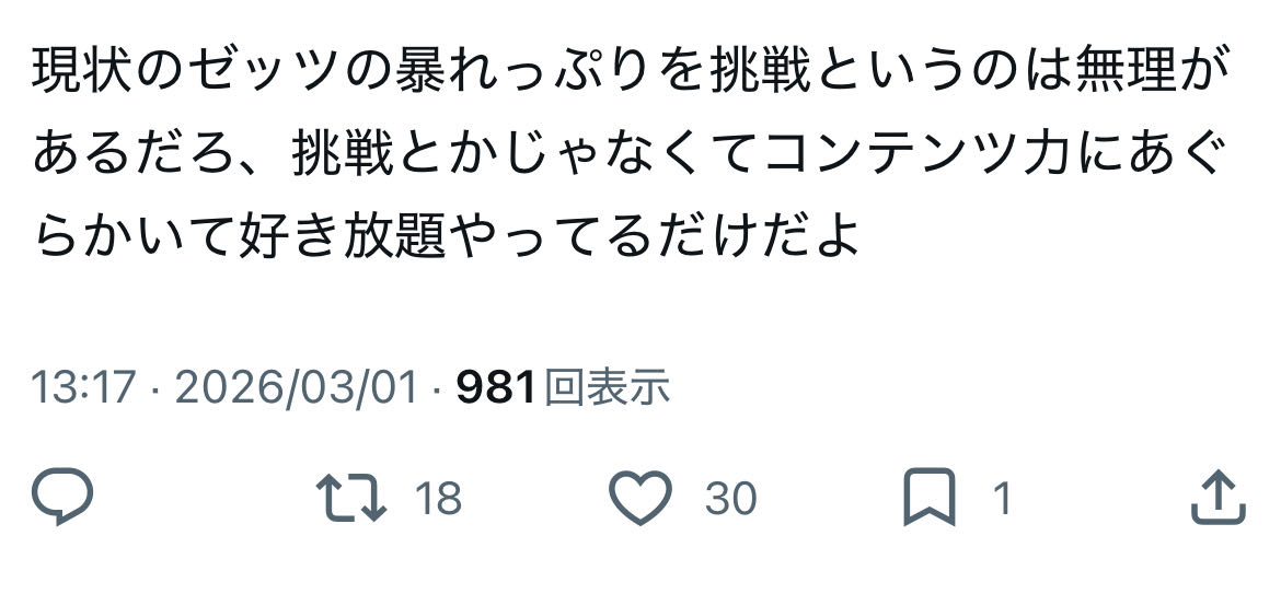 | … | 912無念Nameとしあき26/03/01(日)16:24:19No.1390879832+>ゼッツを悪く言うな |