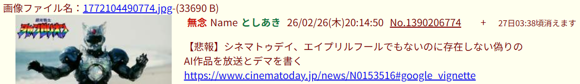 | … | 11無念Nameとしあき26/03/01(日)16:53:19No.1390886161そうだねx2観てないんだし関わらなきゃいいのに |
