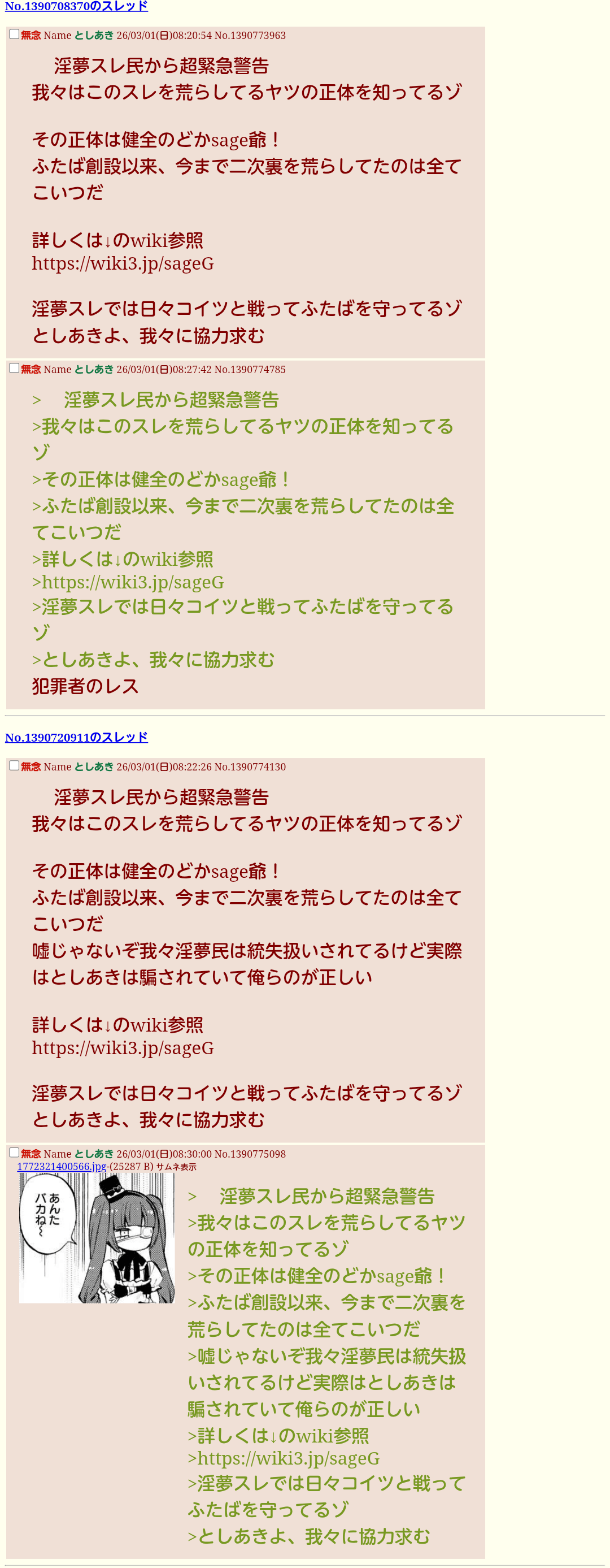 | … | 76無念Nameとしあき26/03/02(月)01:32:30No.1391020802そうだねx1>>昔は淫夢スレでsage爺が暴れてる内は他のスレは平和だったんやけどな… |