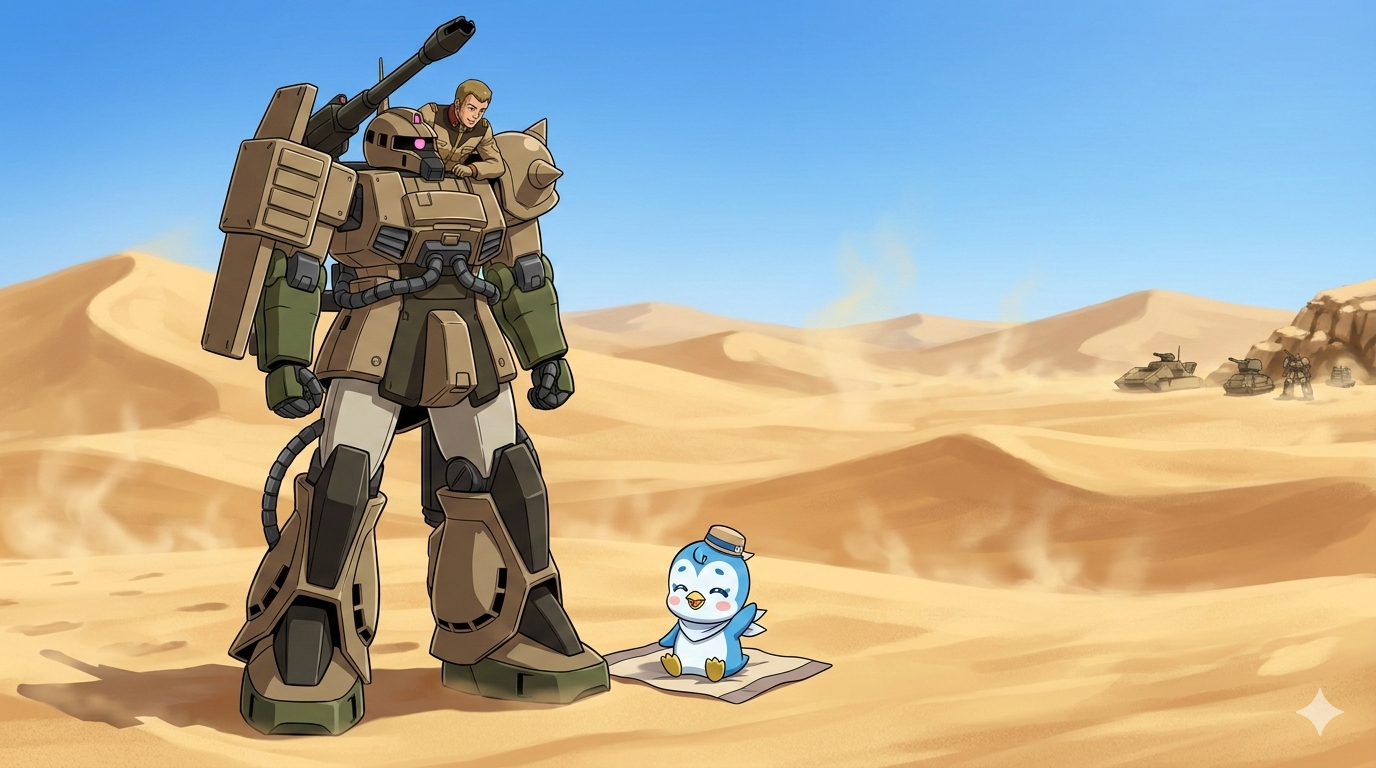 | … | 33無念Nameとしあき26/03/02(月)00:02:40No.1391005012そうだねx4 1772377360245.png-(1739023 B) [砂漠の背景で、ヒーリングアニマル ペギタンとジオン軍モビルスーツのザクキャノンが並んでいるイラストをお願いします] |