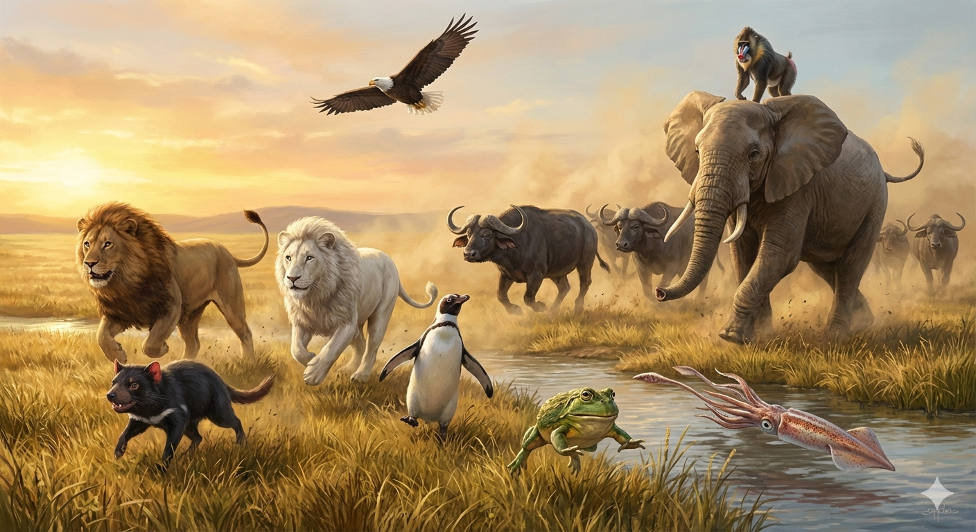 | … | 34無念Nameとしあき26/03/02(月)00:06:11No.1391005768そうだねx3 1772377571619.png-(2293193 B) [草原地帯を走る、ペンギンとライオンと白いライオンとタスマニアデビルとアマガエルとバッファローと烏賊とマンドリルと象と鷲のイラストをお願いします] |