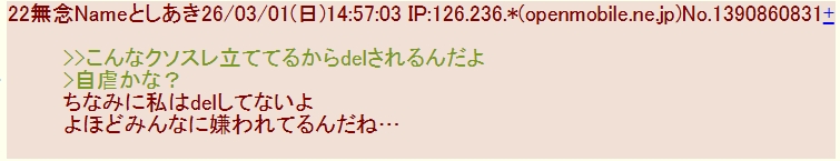| … | 103無念Nameとしあき26/03/02(月)01:45:30No.1391022230そうだねx5>どこ行ってもバレバレの自演してるねうんこくん |