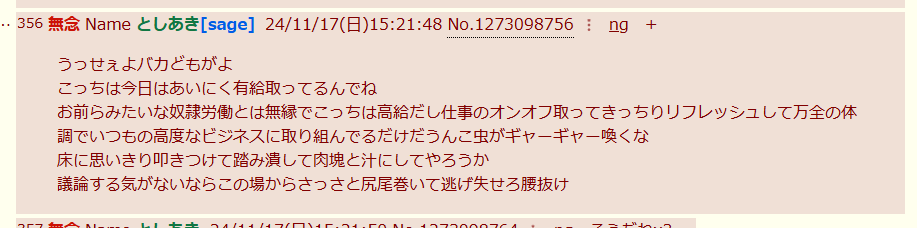 | … | 125無念Nameとしあき26/03/02(月)02:03:04No.1391023842そうだねx1>労働が嫌で日曜日はギリギリまで夜更かししますけど仕事もないのに毎日夜中から早朝まで匿名掲示板荒らしに命かけてる老人とか哀れすぎて草も生えませんよ |