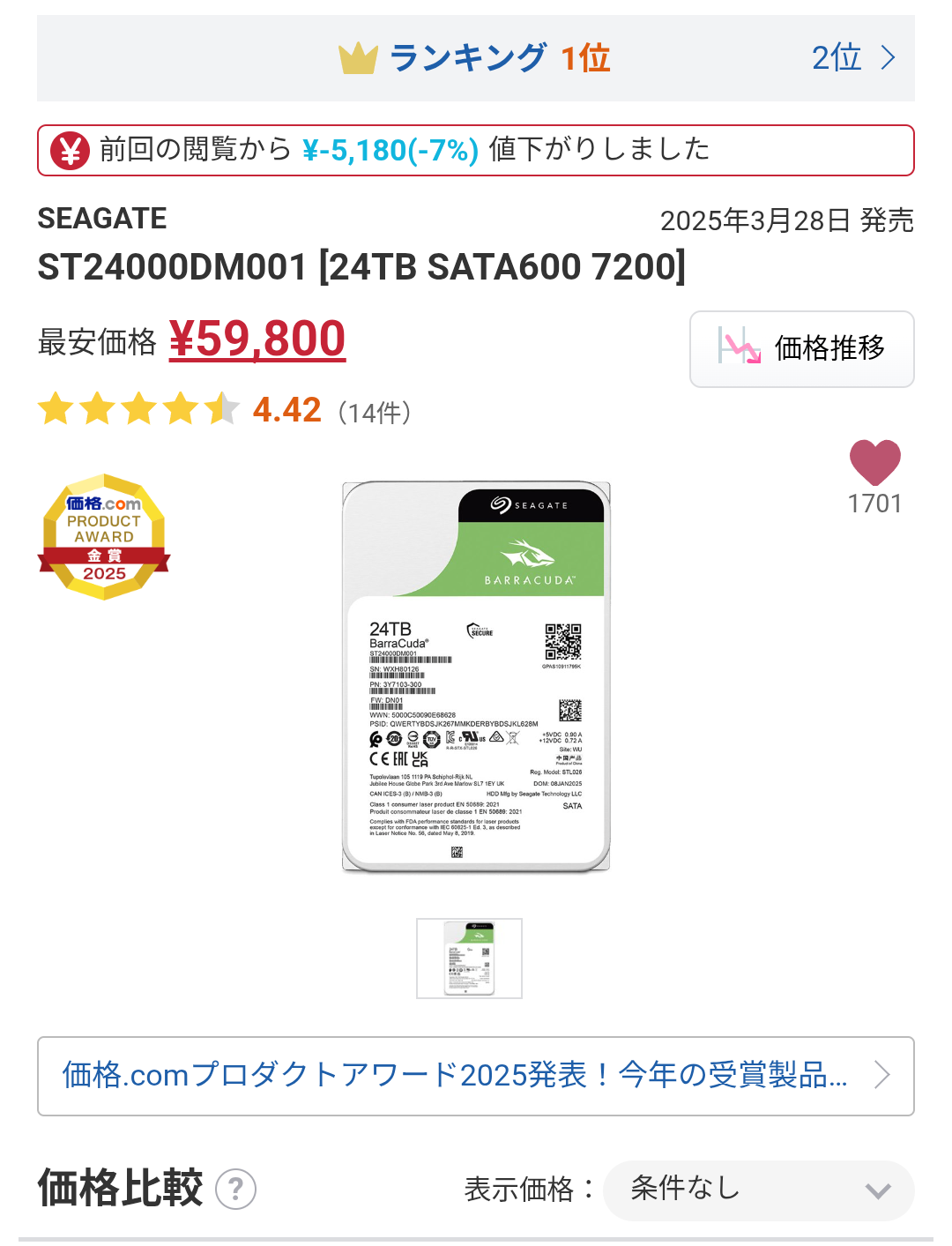 | … | 78無念Nameとしあき26/03/01(日)23:40:21No.1390999908+ 1772376021587.png-(279094 B) ようやく24TBのHDDが6万切ったけどまだ高いな… |
