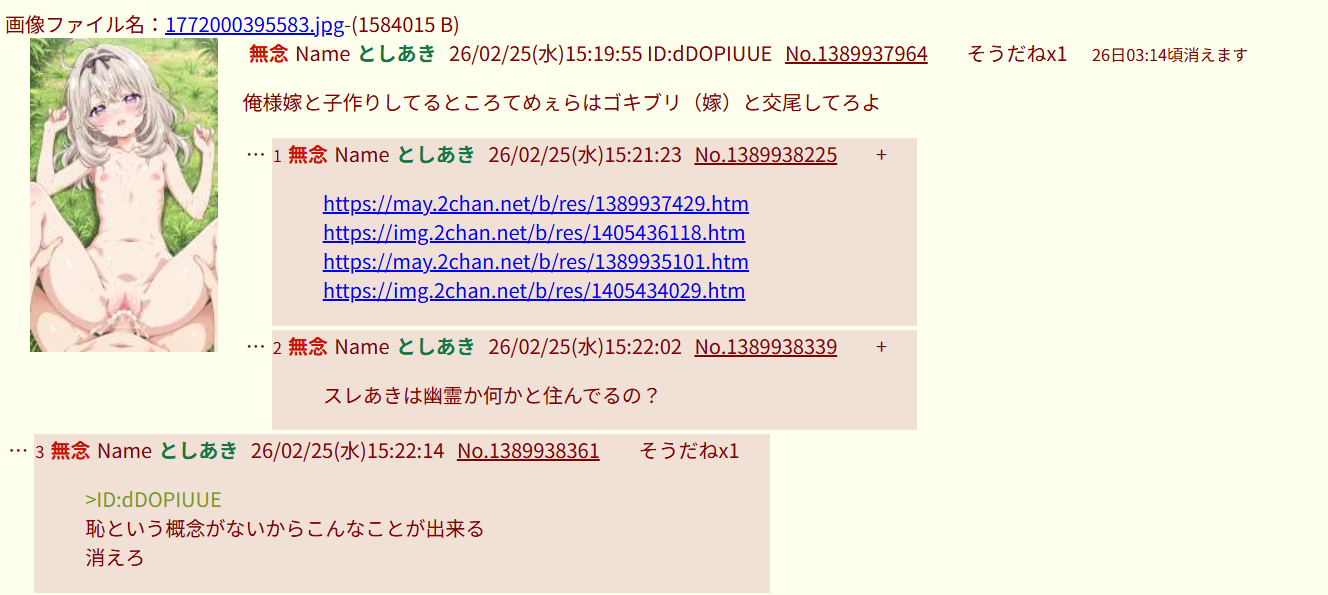| … | 14無念Nameとしあき26/03/01(日)22:36:59No.1390983015+他のスレで暴れてるから |