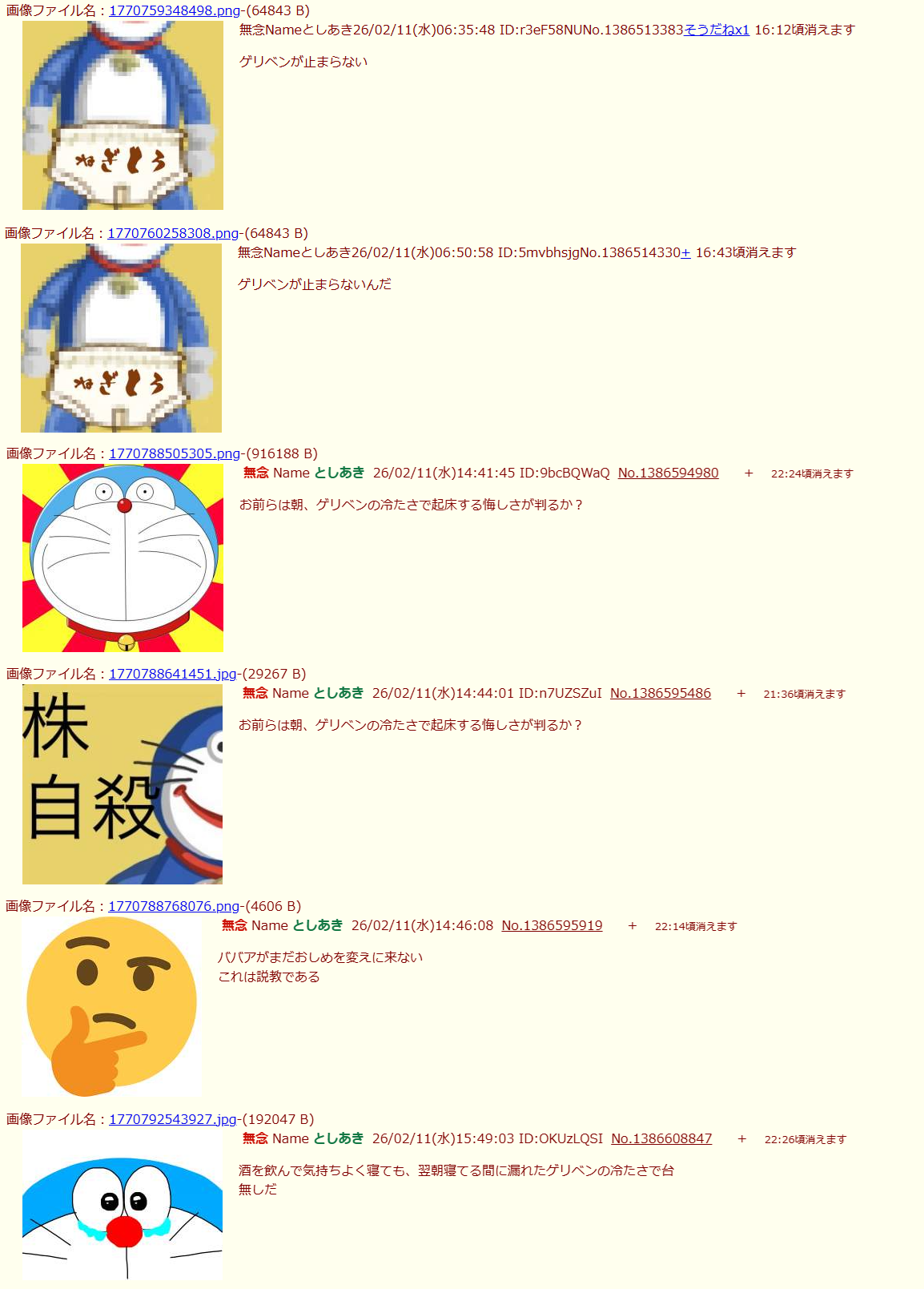 | … | 45無念Nameとしあき26/03/01(日)23:12:37No.1390992675+昔の下痢豚「ふたばは無職童貞の集まりやったー仲間だ」 |