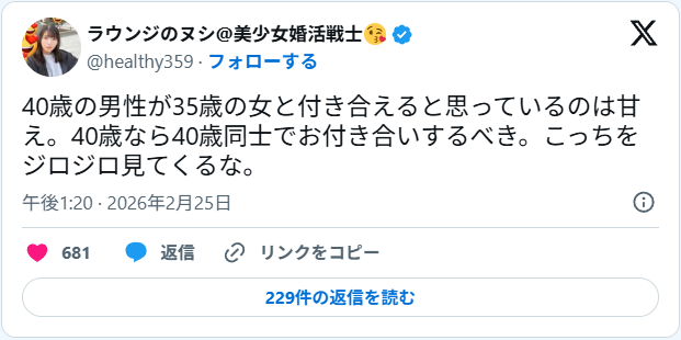 | … | 5無念Nameとしあき26/03/02(月)07:26:47No.1391037250そうだねx29>「40歳の女が35歳の男と付き合えると思うなよ。オジサンとくっついてろ」 |