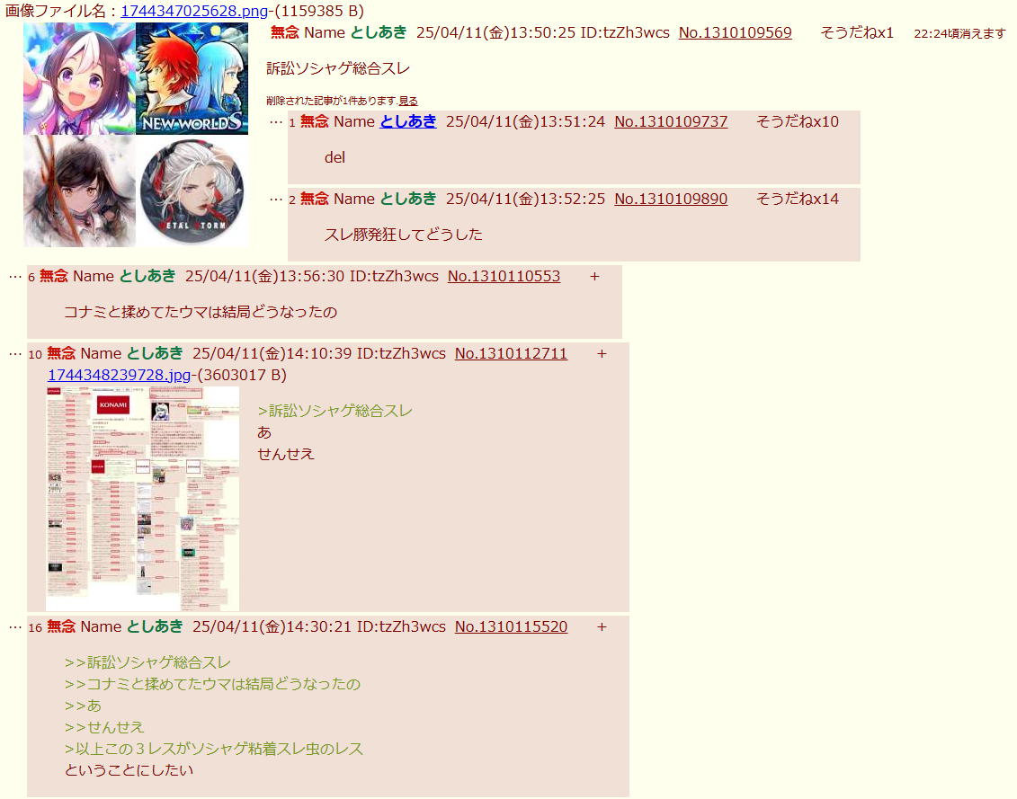 | … | 21無念Nameとしあき26/03/02(月)11:13:56No.1391062307+まぁ中華ソシャゲ以外にも粘着してるキチガイが立ててるスレだって証拠貼られてるのに中華ソシャゲが〜とか発狂してる時点で日本語理解できないんだろ |