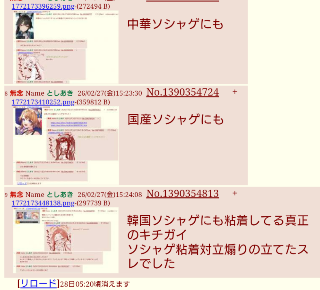 | … | 72無念Nameとしあき26/03/02(月)14:54:26No.1391097269+>昨日中国叩きスレでもソシャゲの話は迷惑だから他所でやれって追い出されてたな |