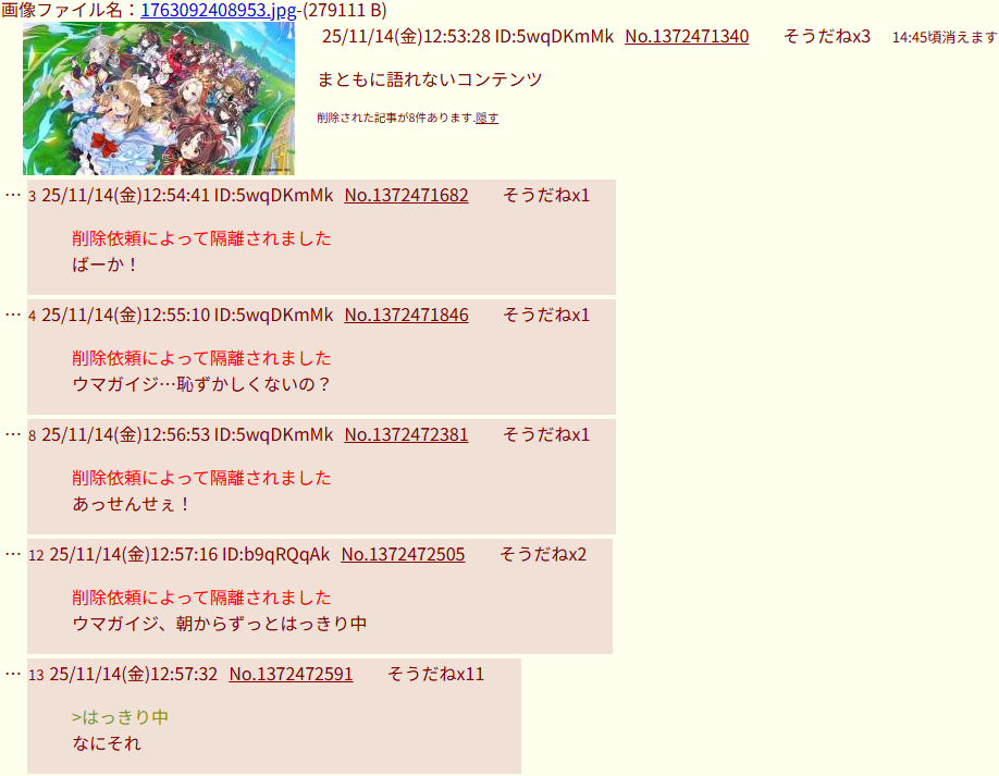 | … | 291無念Nameとしあき26/03/02(月)17:19:42No.1391120072そうだねx3>ブルアカスレのスレ立ててた奴が他ゲー荒らしの常習でふたば出禁になってブルアカスレが立たなくなった事実なかったことにしてて笑う |