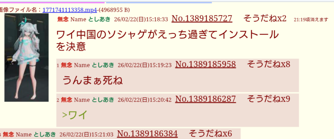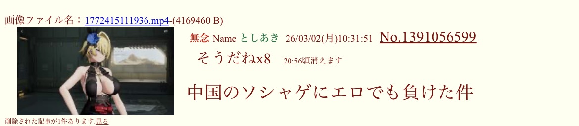 | … | 82無念Nameとしあき26/03/02(月)15:36:27No.1391103465+>中国のソシャゲにエロでも負けた |