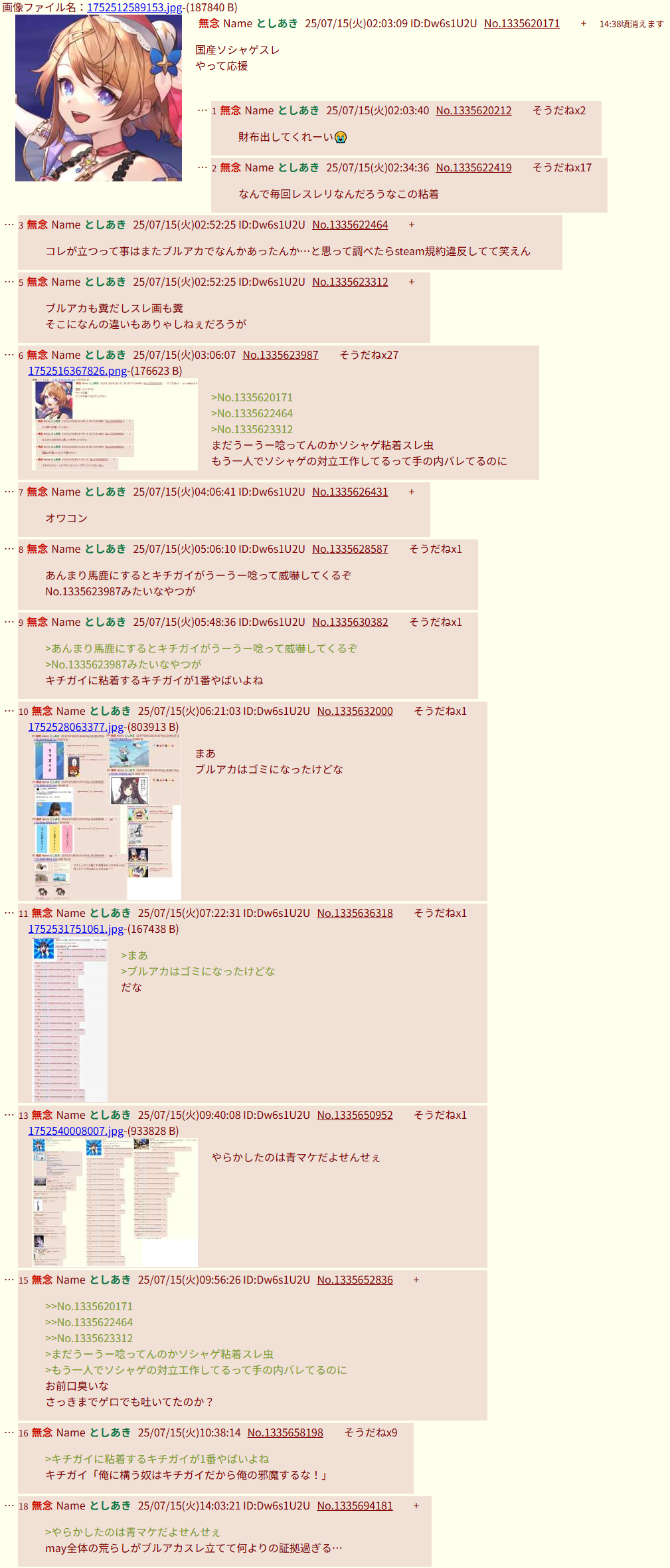 | … | 297無念Nameとしあき26/03/02(月)17:22:49No.1391120610+>ブルアカスレのスレ立ててた奴が他ゲー荒らしの常習でふたば出禁になってブルアカスレが立たなくなった事実なかったことにしてて笑う |