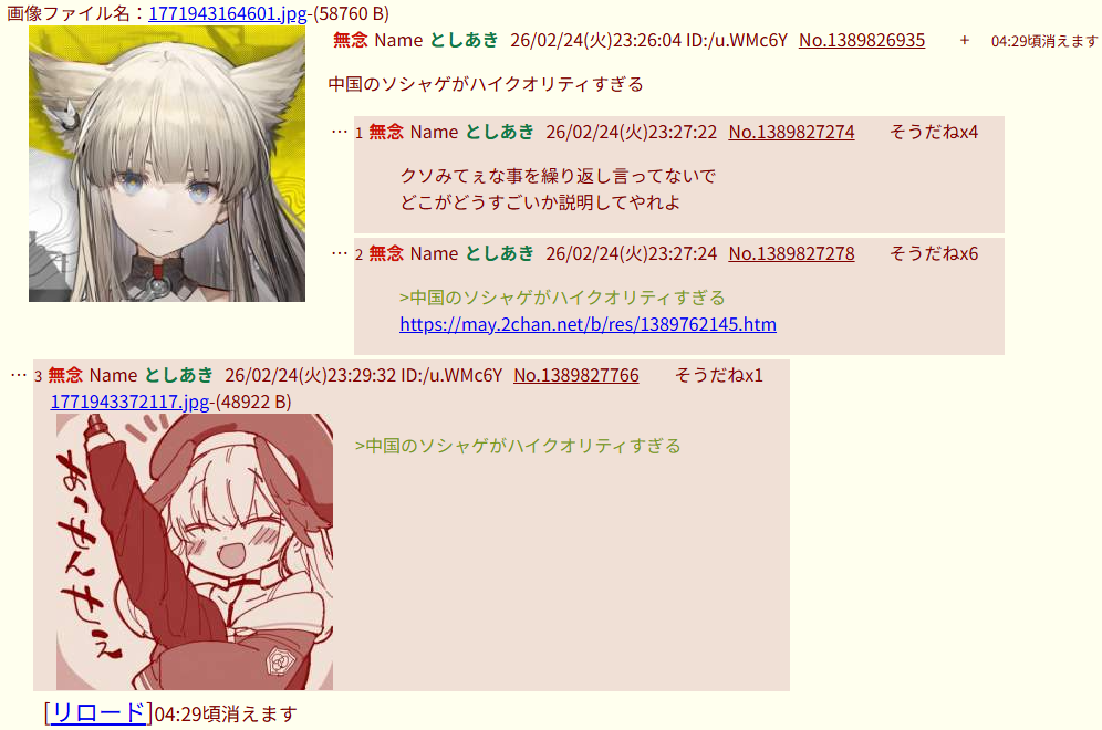 | … | 296無念Nameとしあき26/03/02(月)17:21:21No.1391120367+中国人憎いだけでレスして答え合わせしてるのいるじゃん |