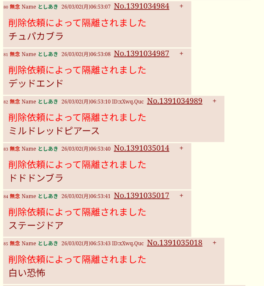 | … | 61無念Nameとしあき26/03/02(月)10:59:35No.1391060425+書き込みをした人によって削除されました |
