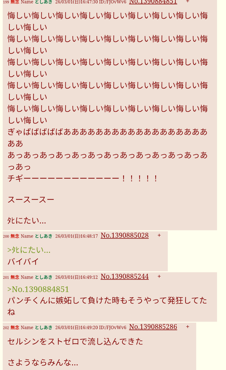 | … | 230無念Nameとしあき26/03/02(月)12:05:02No.1391069647+なんのために生きてるの? |