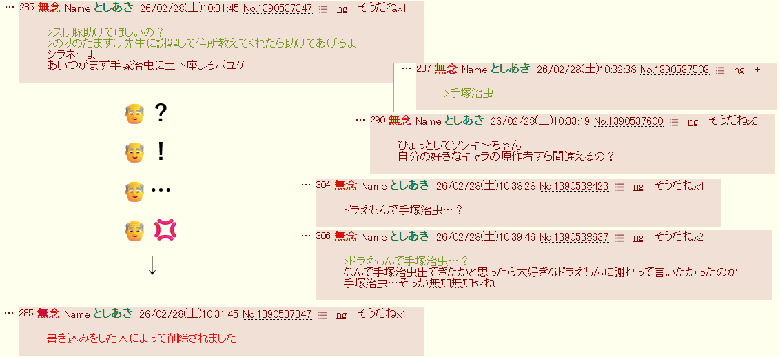 | … | 83無念Nameとしあき26/03/02(月)11:11:51No.1391062024そうだねx2>>スレ豚がドラえもんの作者は手塚治虫と言ってたと聞いて脳が理解を拒んだ… |
