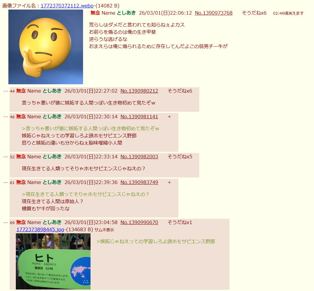 | … | 40無念Nameとしあき26/03/02(月)10:55:11No.1391059812+53歳児のソンキ爺さんが発狂しながら立てたスレ |