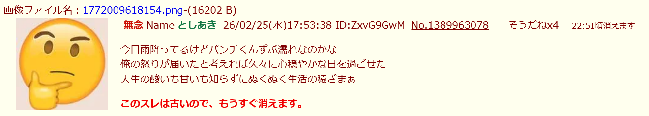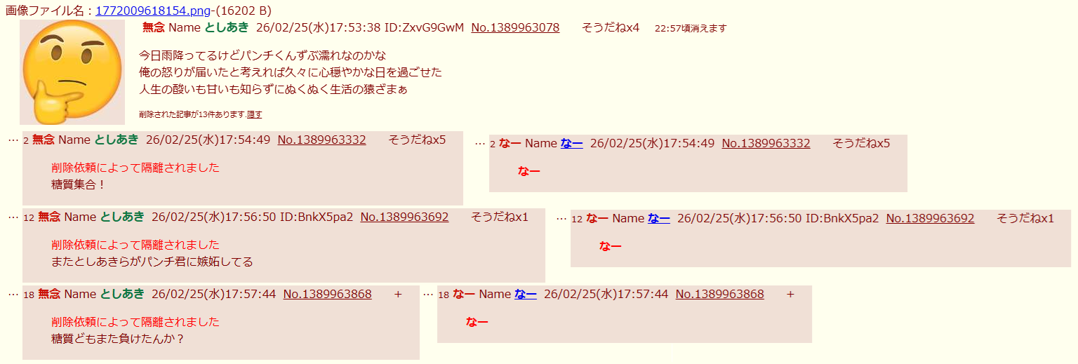 | … | 69無念Nameとしあき26/03/02(月)11:05:18No.1391061157そうだねx1子猿とレトルトカレーに負けたソンキくん発狂中 |