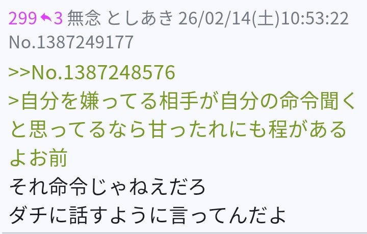 | … | 50無念Nameとしあき26/03/02(月)10:56:57No.1391060063そうだねx2>そのスレとこのスレの主が一緒だって根拠は? |