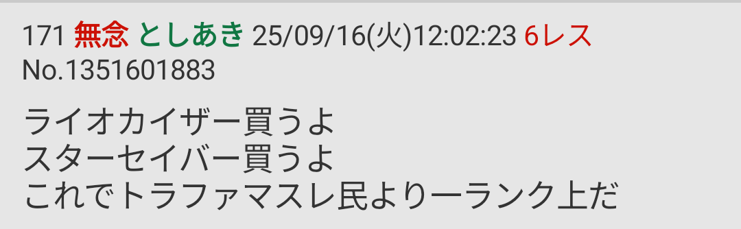 | … | 94無念Nameとしあき26/03/02(月)13:03:39No.1391081151そうだねx1>TFスレから出てくんなよ荒らしさん |